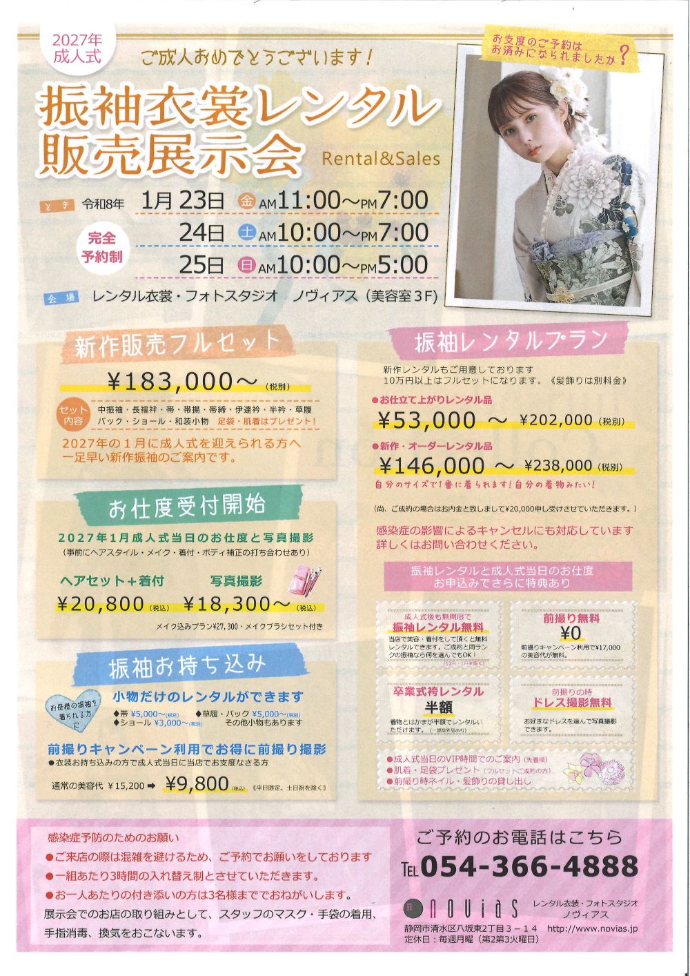 2027年成人式の振袖展示会を行います。※完全予約制とさせていただきます。お手数ですがご予約の上ご来店ください1月23日 11:00~19:00 24日 10:00~19:00 25日 10:00~17:00美容室3F特設会場にて行います。新作販売 ¥183000~振袖レンタル ¥53000~238000お仕度受付中 ¥20800~ ヘア・着付け写真 18300~その他 特典多数あります。詳しくはお問い合わせください。